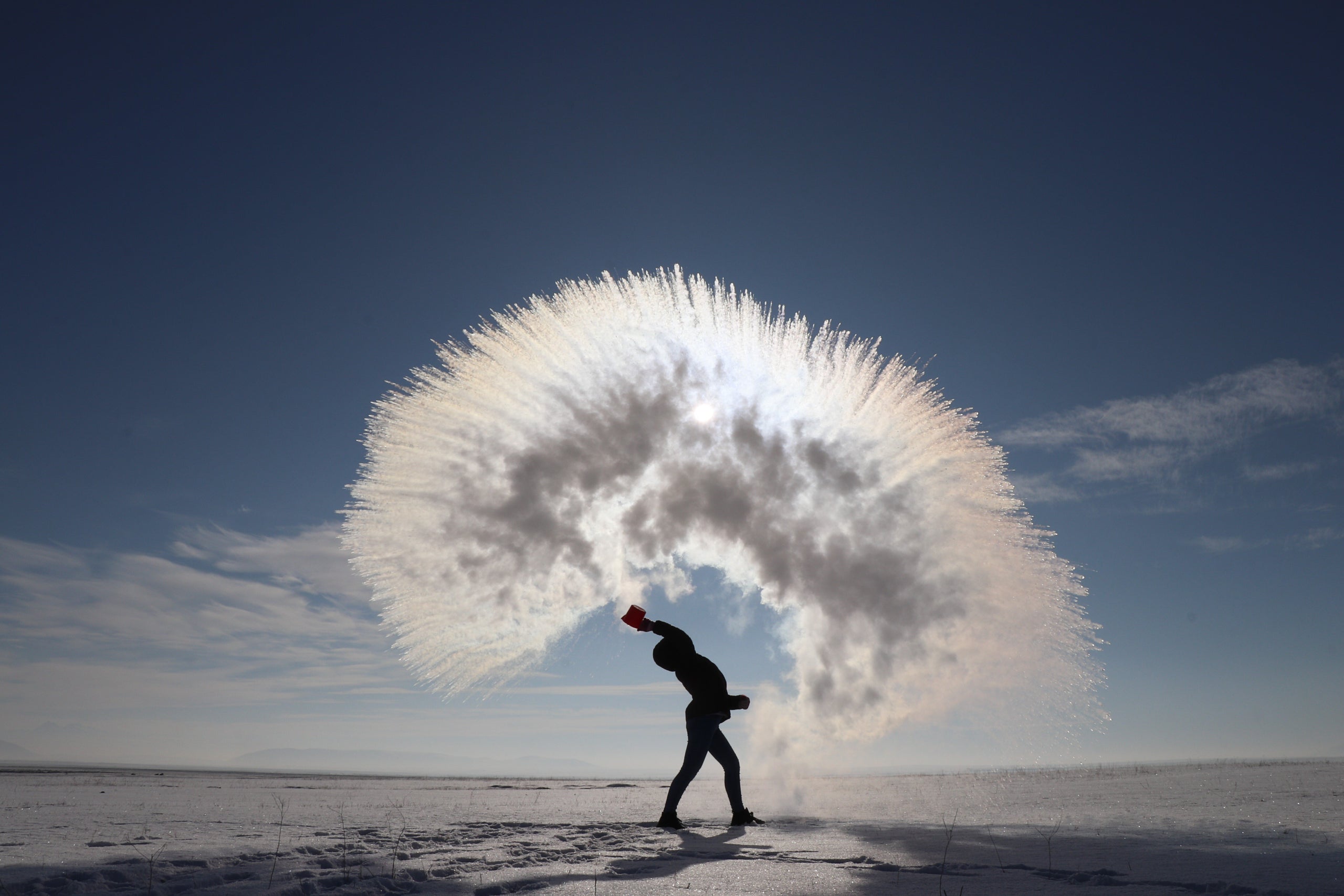 A woman throws hot water into the freezing cold air in Kars, Turkey, on Jan. 19.