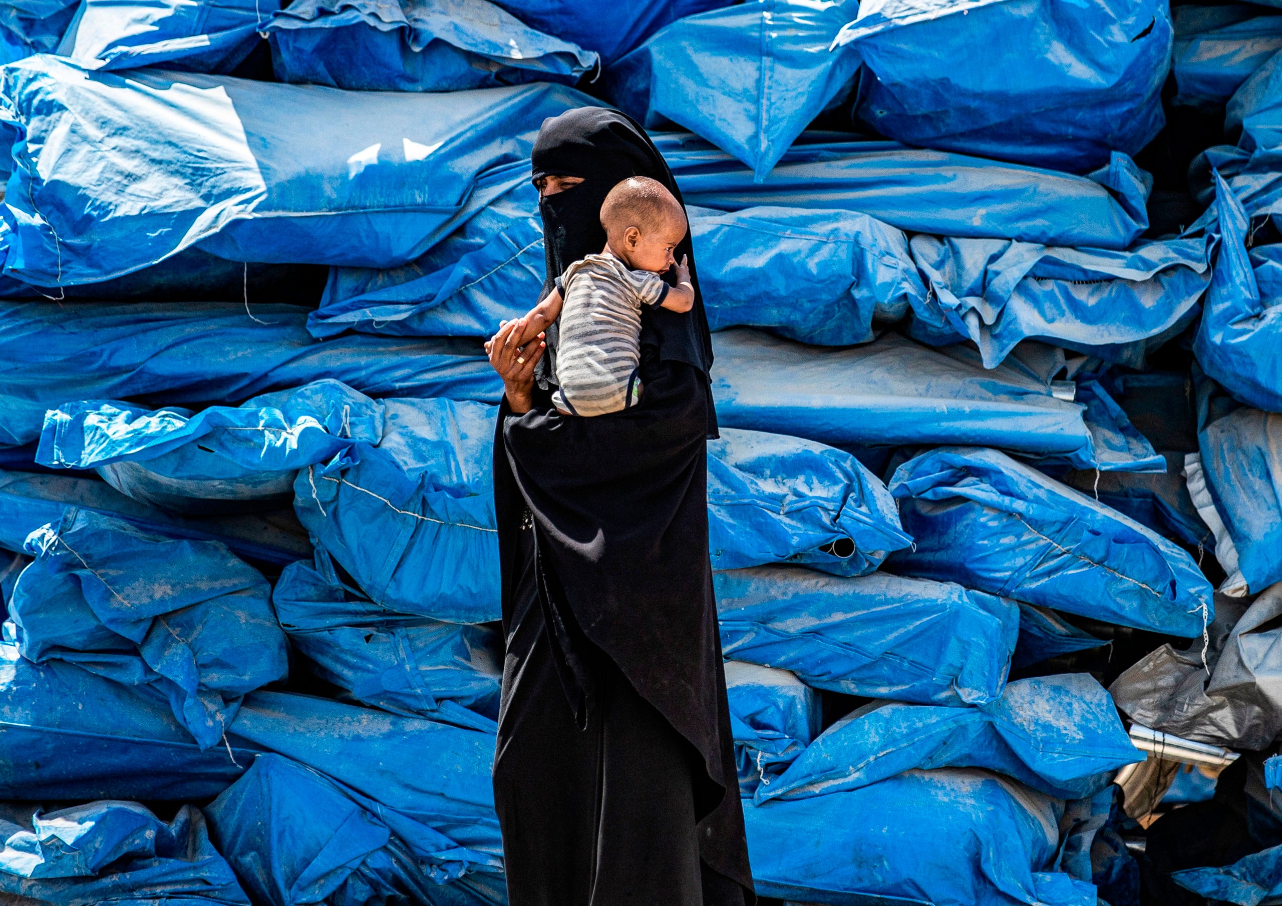 A woman carries an infant at al-Hol camp for displaced people in northeastern Syria on July 22, 2019, as people collect UN-provided humanitarian aid packages.