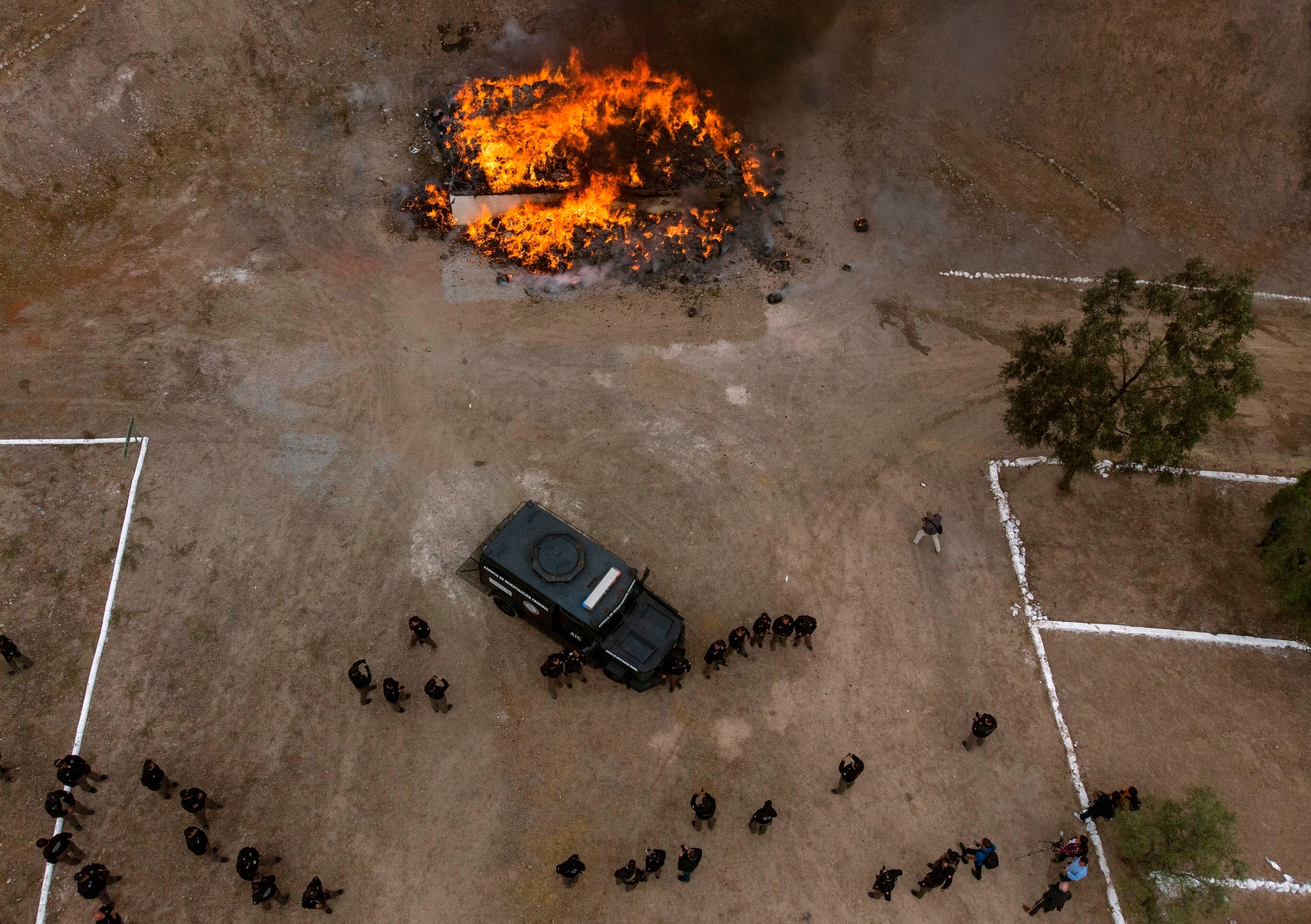 General Prosecutor’s Office agents stand near 26 tons of seized drugs as they are incinerated at the 28th Infantry Battalion facilities in Tijuana, Mexico, on Thursday.