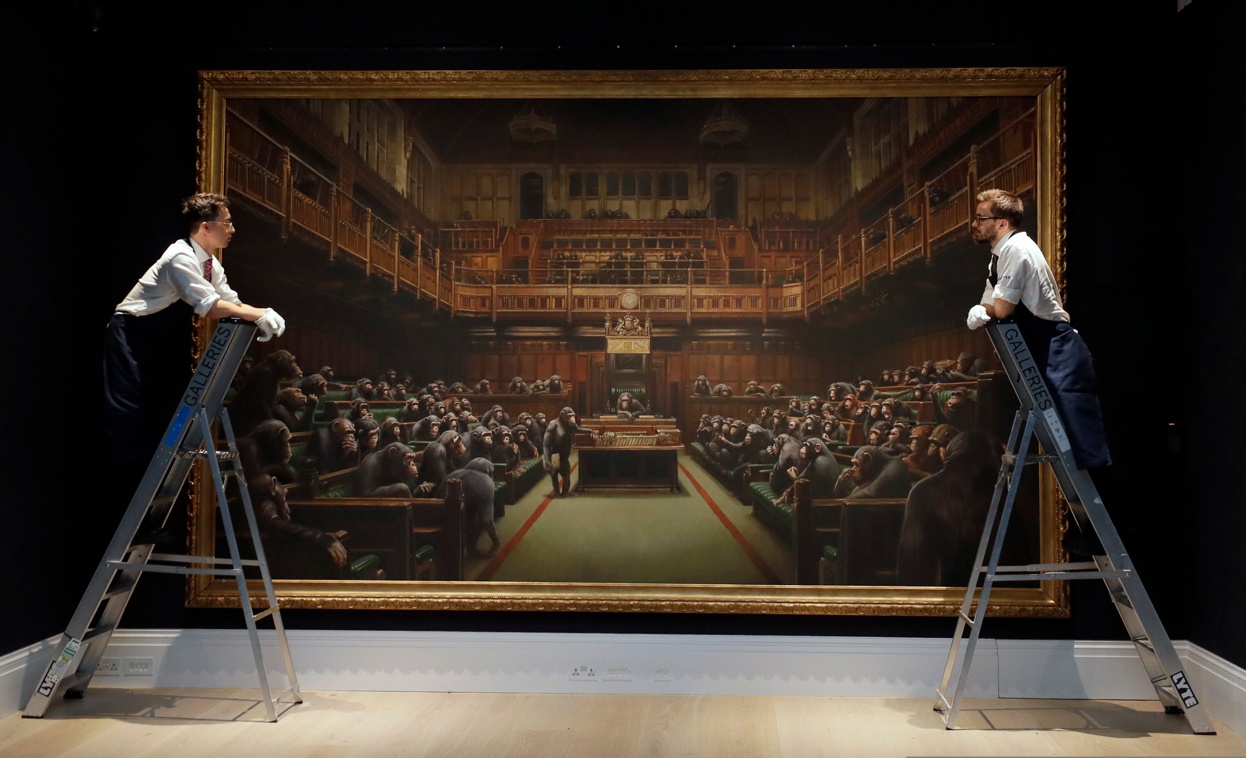 Sotheby’s employees look at a painting by anonymous street artist Banksy on display Friday at Sotheby’s auction rooms in London.