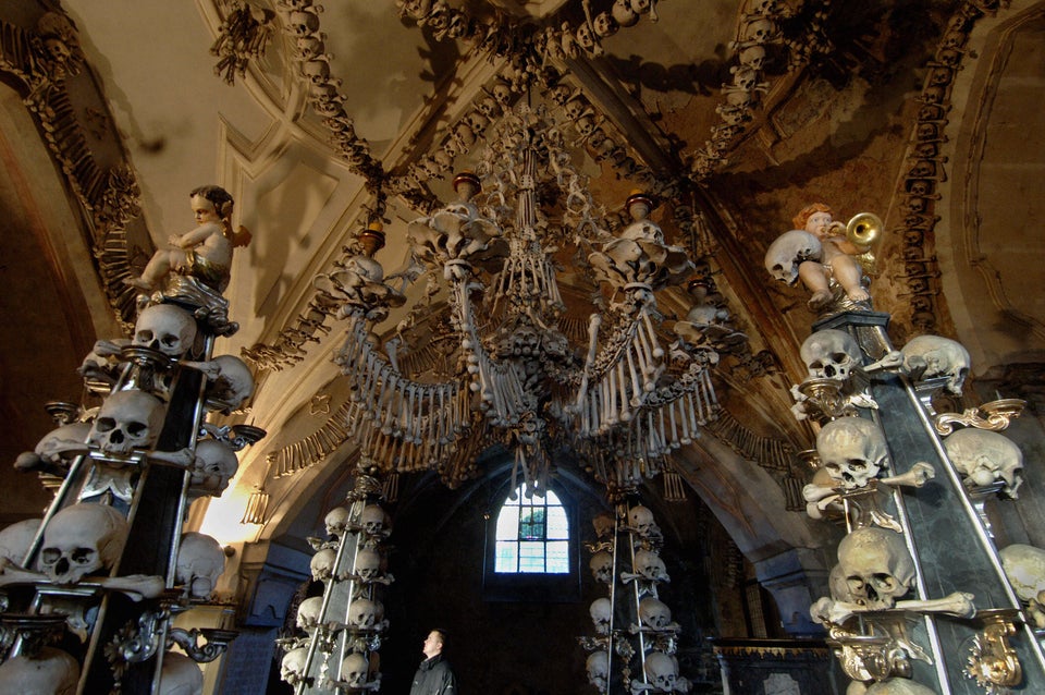 Located beneath the Cemetery Church of All Saints, the Sedlec Ossuary in Kutna Hora, Czech Republic, is decorated with the bones of more than 40,000 people.