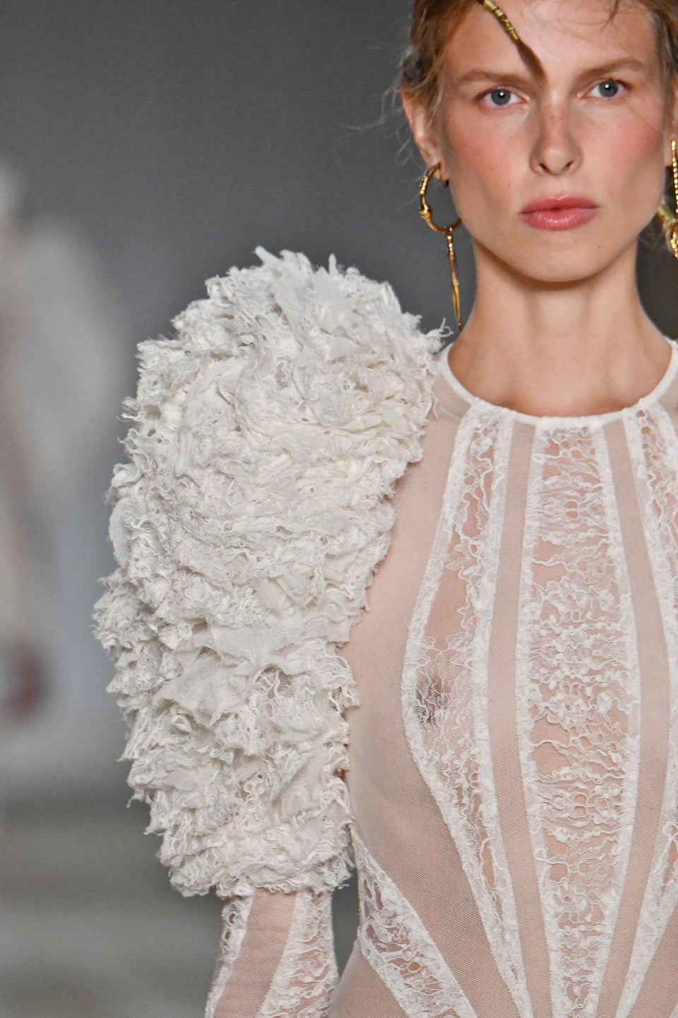 But she didn’t do it alone. Burton enlisted the entire McQueen team to help realize this season’s vision, which includes meticulous attention to detail, plenty of award season fodder and a dreamy loop of Instagrammable moments. According to fashion and beauty industry publication WWD, Burton worked in Ireland with “some of the last remaining damask linen weavers, beetling mill workers and flax farmers” to create stunning results.