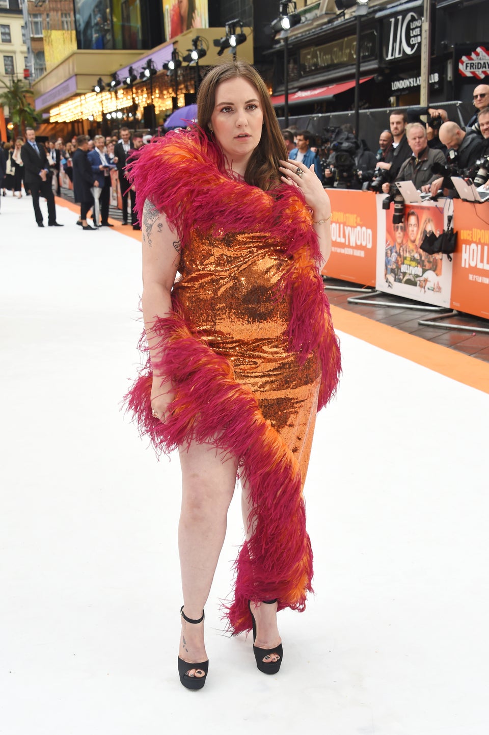 Lena Dunham looked on fire in orange sequins and feathers at the London premiere of “Once Upon A Time… In Hollywood.” The week also featured quite possibly the fanciest pajama set we’ve seen. And we even got a tie-dye moment, courtesy of Jason Sudeikis.